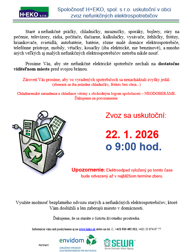 Milý občan, Zber elektroodpadu 22.1.2026 o 9:00 sa začína o 09:00.